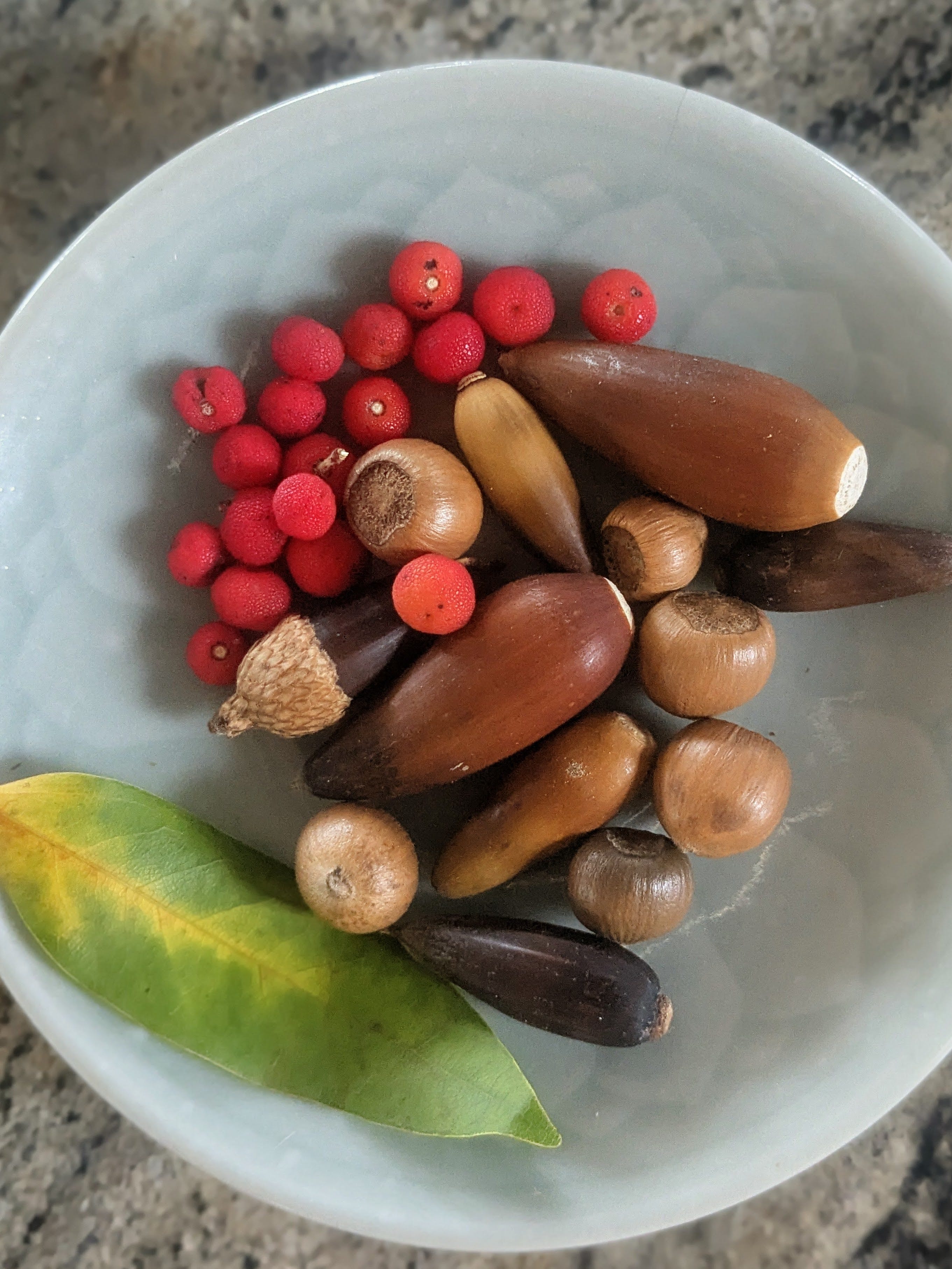 But fall has a special something: the rich colors. The cute little dimpled caps on dark smooth acorns. The wild fires of green and yellow, purple and red exhibited in the fallen bay leaves & drupals.